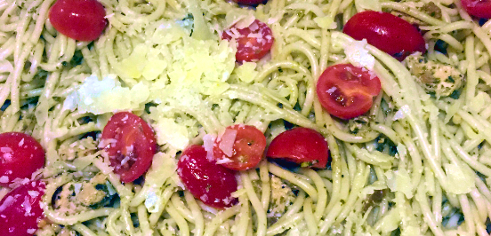 Drain the pasta and in a large (warmed) serving bowl toss the pasta with the remaining pesto, chicken mixture and cherry tomatoes. Garnish with a generous sprinkling of shaved parmesan cheese.